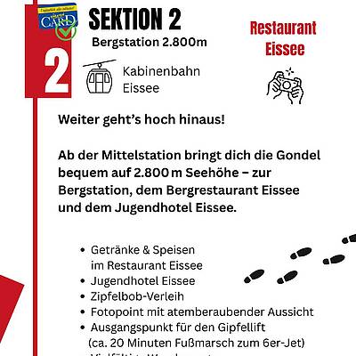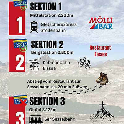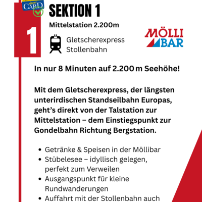 In nur 8 Minuten bringt dich der Gletscherexpress bequem zur Mittelstation auf 2.200 m. Von dort aus geht’s weiter mit der Gondel zur Bergstation auf 2.800 m – mit Restaurant, Jugendhotel, Fotopoint und Ausgangspunkt für zahlreiche Wanderungen.